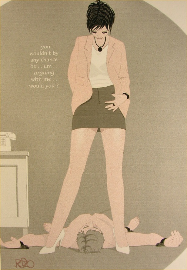 "You wouldn’t by any chance be.. um... arguing with me.. would you?" She said it as if unable to believe her ears. He stared straight up at her as she stood over him, wondering what on earth had made him say it. Argue with her? That would be complete madness. There she stood, legs apart and the spiked heels of her shoes either side of his head. He was bound, of course; totally helpless and naked with his wrists and ankles held wide apart by the restraints buckled round them and bolted to the floor of her office.