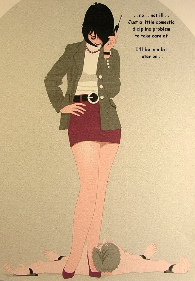 "Sorry, I’ll be a bit late in today," she said. "No, I’m not ill. Just a little domestic problem to take care of. I’ll be in a bit later on." She put down the telephone and turned her attention to the man at her feet. Really, it was too much when she was so busy at work. Quite inconsiderate of him to misbehave so badly when he knew she really did not have the time to spend punishing him properly. Ah well, priorities, priorities. And undoubtedly the first priority was to ensure he understood his proper place. After all, it would be no good him thinking he could get away with anything just because she had other pressing matters on her mind.
