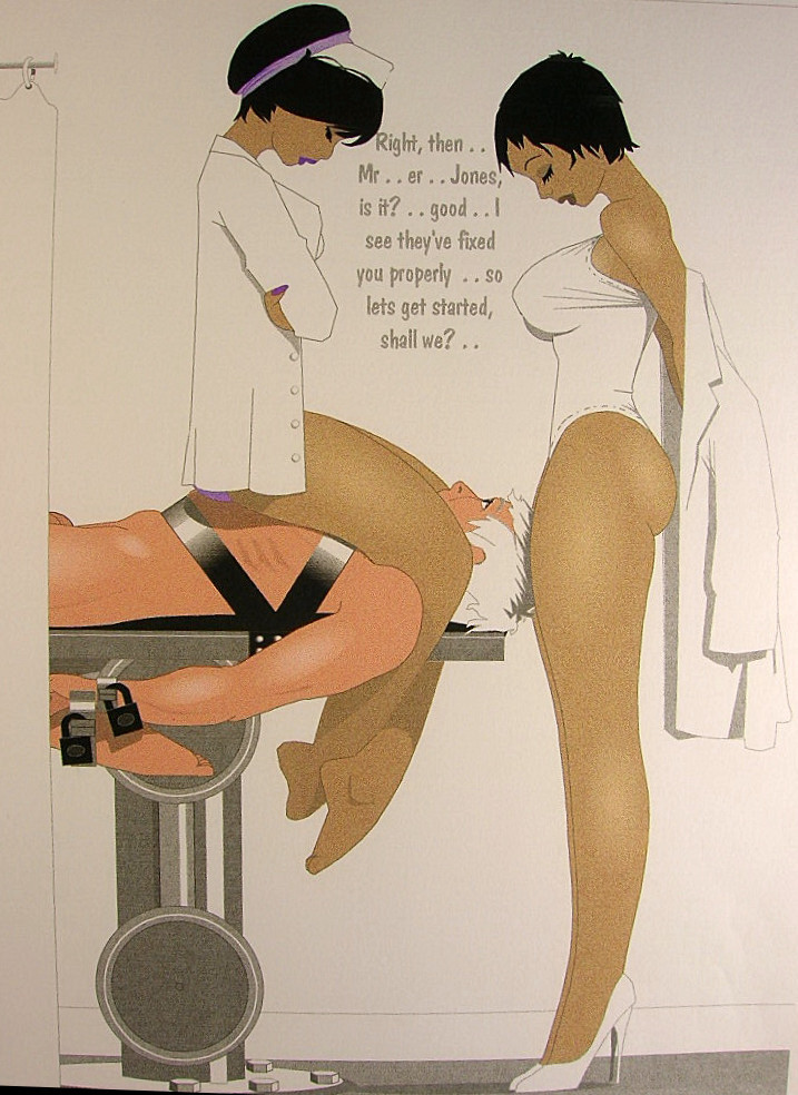 It had been many months now that he had had the problem. His reluctance to explain it to a doctor had kept him away from the surgery, until finally he had become so frustrated that he really had no choice. He could not do it. He had no problem getting it up and, more to the point, keeping it up. He just could not do it. He was fit, strong, active and healthy. He could quite happily go on for hours, way past the point where not only was any woman completely satisfied but actually demanding that he stop because she had had more than enough. And, every time, he still had not done it. Two young nurses met him when he arrived at the clinic. He was greatly relieved to find they had received the doctor’s comprehensive notes and that he would not have to explain it all to them. They merely asked him to confirm his name and date of birth, and then led him into one of the rooms at the side of the main corridor. "Take your clothes off, please," said one of them, "All of them. Then lie on the couch on your back, hands by your sides. The specialist is running a little late, but she’ll be here shortly. We’ll help you get ready for her." He did as he was told, uncomfortably aware that the presence of the two young nurses was causing him intense arousal, which must have been obvious even before he had finished removing his clothes. He lay down and closed his eyes, trying to concentrate on anything other than those firm young bodies under their crisp, clean, white uniforms. "The specialist will need you to keep perfectly still while she examines you and performs any procedures she feels necessary," she told him. "So I’m just going to do up these straps to help keep you in one place. Let me know if it’s too uncomfortable at any stage." He kept his eyes closed as he felt the wide leather straps being buckled across his chest and across the tops of his thighs. These effectively stopped him moving at all. His hands were lifted gently from the couch and straps buckled around each wrist. He felt similar straps being buckled around each of his ankles. He opened his eyes as suddenly his legs were pulled wide apart off the edges of the narrow couch, and bent backwards towards his wrists. There were two simultaneous clicks from either side of the couch as the wrist cuffs were locked to the ankle cuffs. "Hey! That’s really uncomfortable," he complained. "Good," she replied calmly, "Thank you for letting me know. I’ll tighten it a little more until it hurts properly. Sarah, would you gag him now, please. Just until Miss Strict gets here." The gag, a thick tapered plug on a wide base, was forced between his lips and into his mouth. Sarah buckled it tightly behind his head. "Now," said the first nurse, "We have a few readings to take before Miss Strict arrives. You’ll like her, and she understands exactly the reason you’re here. She has quite the same problem herself – she so often goes on for hours and hours without quite getting there, but she’s very persistent. I’m sure you’ll get along with her just fine. Have you had your blood pressure taken before?" He nodded, at the same time vainly trying to make it clear he was unwilling for any of this to continue and just wanted to be released. "Good," she said. "You’ll recognise this. The pressure cuff usually goes around your arm and we pump it up. It feels quite tight, but it doesn’t hurt. Now, this one is a little different. We put it around your genitals – if you look closely you can see the inside of the cuff is rough and spiky to stop it slipping. Then we inflate it just like the old-fashioned blood pressure device on your arm, only we have to put rather more pressure into it when we’re dealing with that part of your body, so it will feel more than a little tight." He shook is head frantically, but she was already wrapping the pressure bandage around his testicles and his rigid member. She started to inflate the cuff. As it tightened he felt an intense pain of it squeezing his testicles, and at the same time the roughness of the inside surface pressed its spikiness painfully into his skin. If he had not been gagged he would have shouted at the intense pain of it. She placed the end of her stethoscope on the very end of his hardness, and listened intently as she released the pressure. "No," she said, disappointed. "I couldn’t hear the pulse properly. I’ll have to do it again. Sarah, could you help me please. I want you to pump it up a little more this time and control the pressure while I hold onto this and listen for the pulse." The pressure increased again even more painfully than before. He screamed through his gag as she jerked his hardness one way and then the other before she was able to get the reading she needed. "Perfect," she said, unwrapping the deflated cuff and putting it away. "Now we need to take your temperature." Somehow, he knew exactly what was going to happen even before she produced the oddly shaped thermometer and inserted it deeply into his urethra. He was totally powerless to stop her. His body shook with pain and discomfort. The door to the room swung open and another woman walked in. "Ah," said the first nurse," Good morning, Miss Strict. He’s all ready for you." Miss Strict walked up to his and stopped with the fronts of her thighs just touching the top of his head as he lay there. She looked down at him. "He doesn’t look very happy," she commented. "And you’ve gagged him. He’s not good to me like that." "I’ll take the gag out," answered the nurse. "Please do. Would you sit on his chest, if you’d be so kind. It helps if there’s a little more pressure on him, I always find. You can take off your shoes, and your skirt so that you don’t crease it." "Right then... Mr... er... Jones, is it?" Miss Strict continued as she slipped off her long white coat and dropped it behind her. "Good. I see they’ve fixed you properly, so let’s get started, shall we?" The nurse clambered on top of Mr Jones